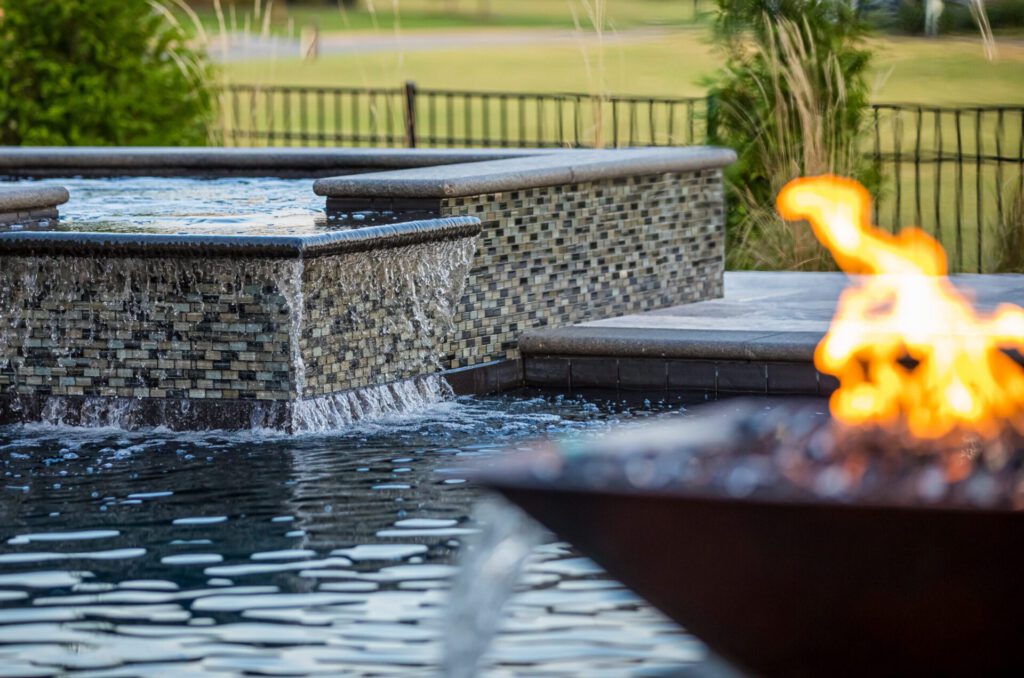 Fire features and lighting add an extra layer of warmth and beauty to custom pool designs, especially at night. The contrast of cool-toned water with amber light makes your outdoor pool inviting and cozy for evenings of entertaining or nighttime swimming.
