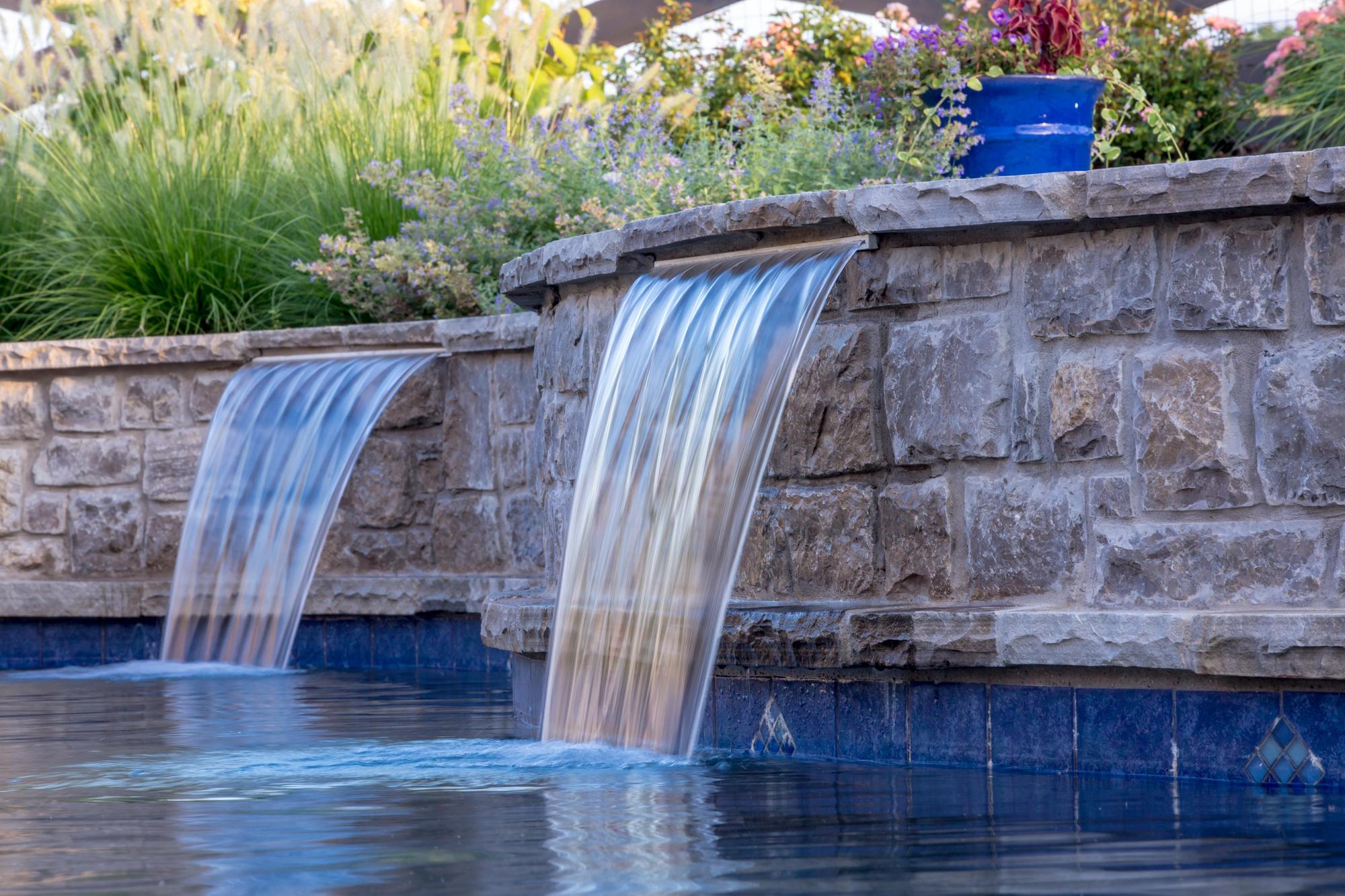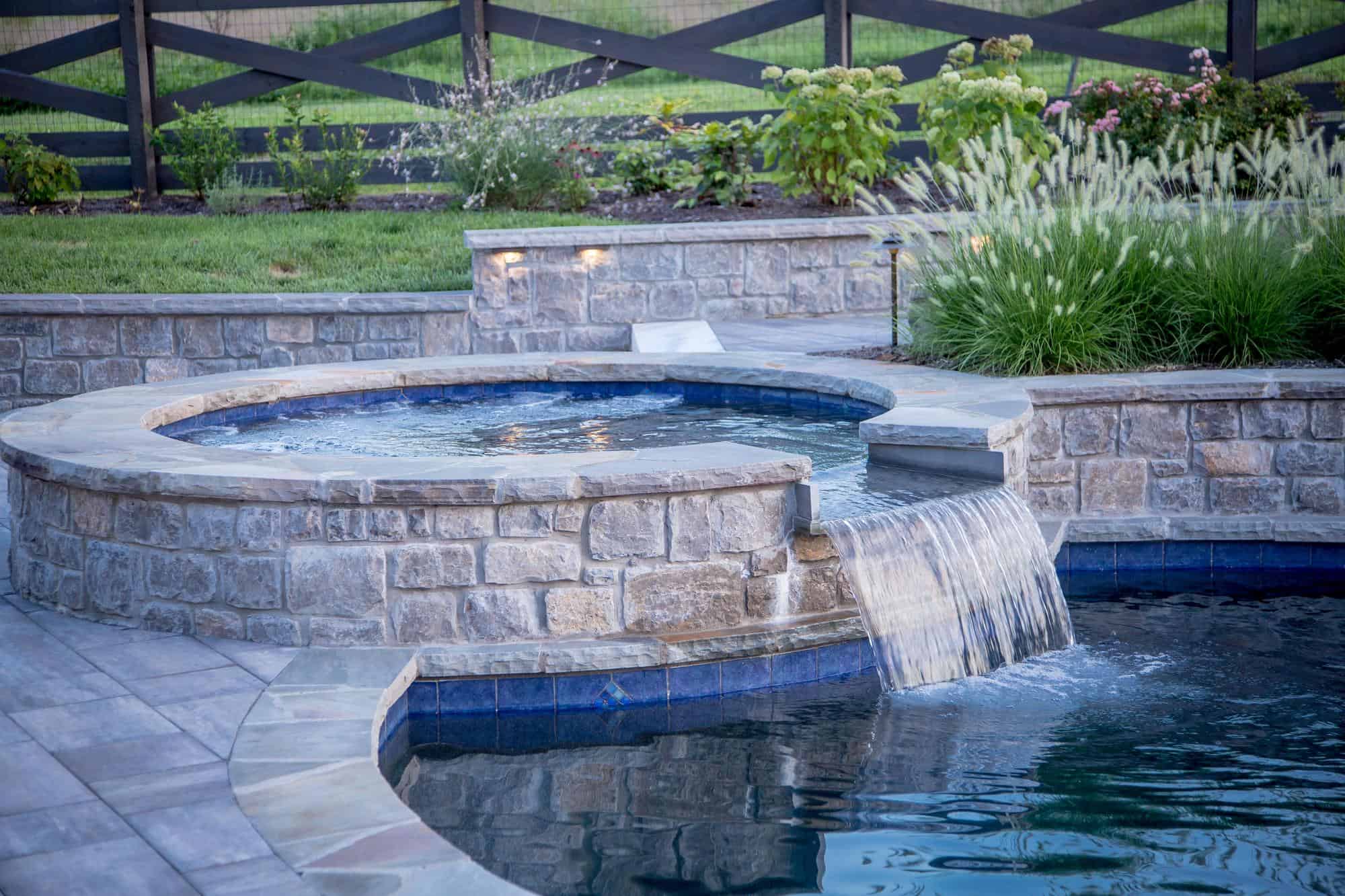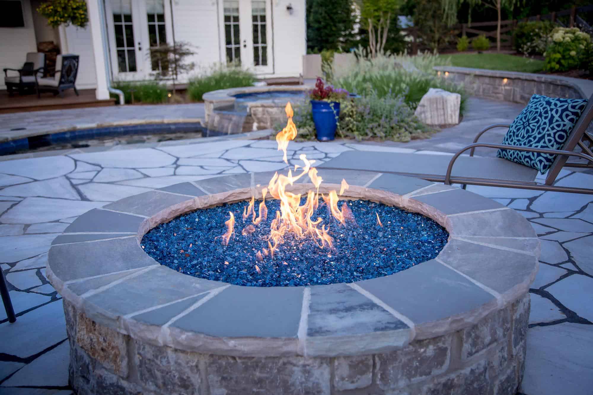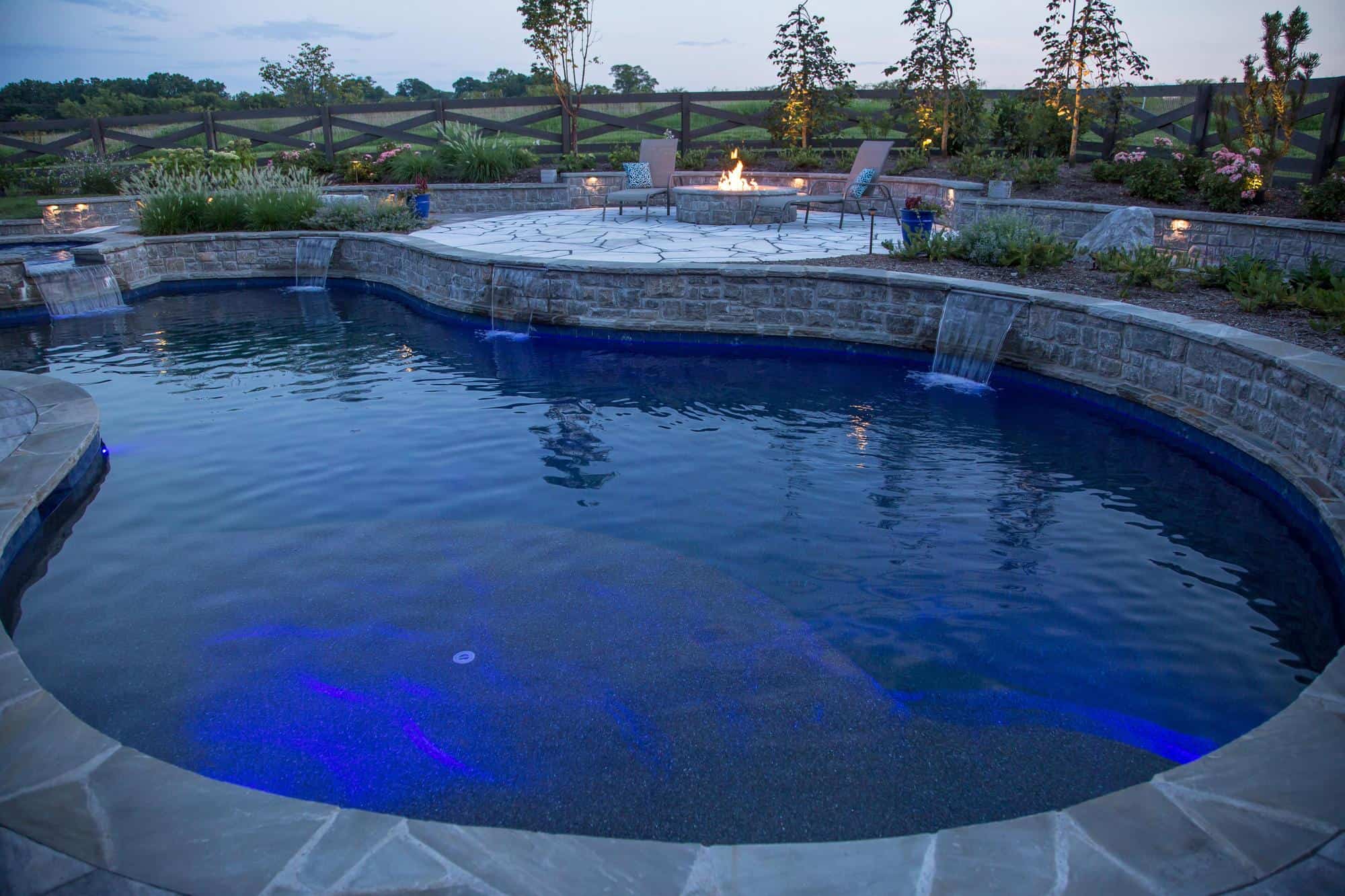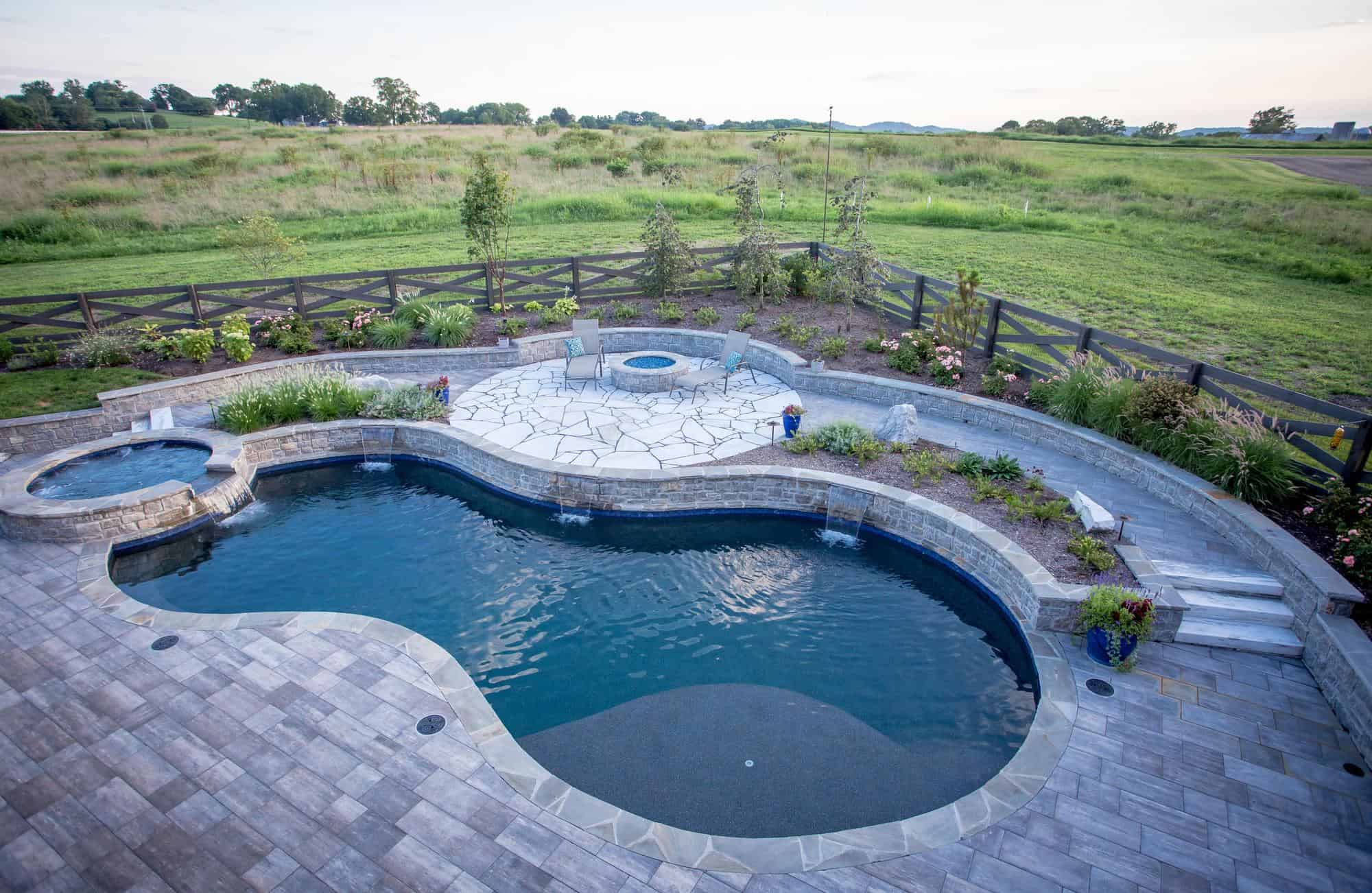 The design-build construction project features a custom-shaped pool with embedded water features and a whirlpool. It offers a paver design that draws the eye to a fire pit and seating area. Whether you are diving into the pool in summer, relaxing in a whirlpool in fall, or cozying up by your fire feature in the winter, this outdoor design is perfect for entertaining any time of the year.