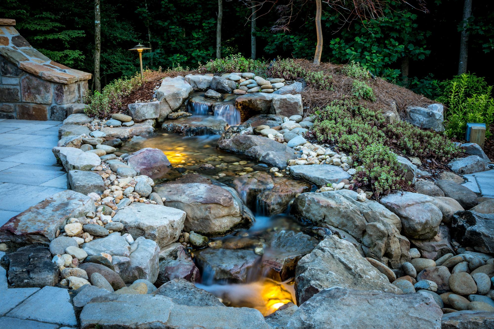 This a dream for anyone looking for the ultimate escape in their backyard. This outdoor experience includes a custom fireplace, an intimate seating area, an expansive outdoor kitchen with ample prep space, and a dining area. Our team added a creek with stone beds to add organic elements back into the space.
